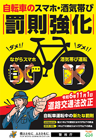 2026年4月から自転車の交通違反に「青切符(反則金)」制度が導入され、16歳以上の違反に対し約110項目で3,000円〜12,000円の反則金が科される。スマホながら運転や酒気帯び、逆走、信号無視、無灯火などが対象。また、2023年4月より全年齢でヘルメット着用が努力義務化されている。 (政府広報より)