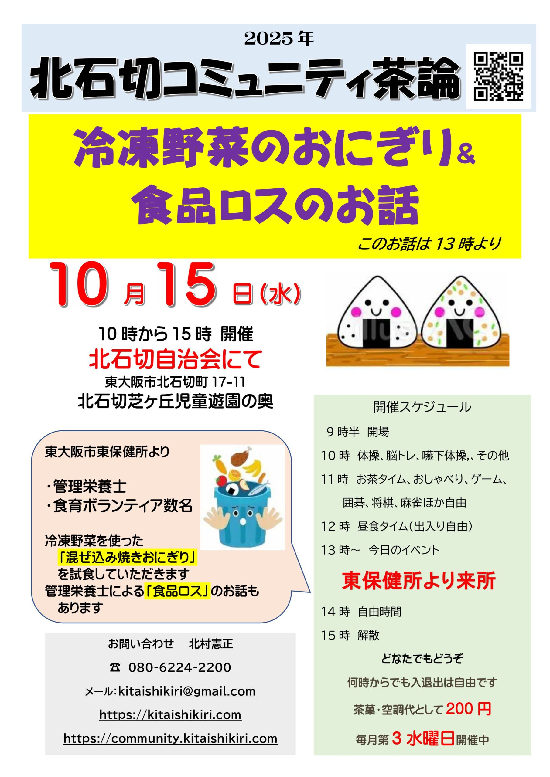 食品ロスの話と簡単料理の試食 その他 2025.10.14 暑さが収まったかに見えますが、日中はまだまだ暑い日が続きます。10月はいろいろと行事が入って忙しいですが、ぜひお越しください。 大阪府でも食品ロスのイベントがありますね。ちょっとした知識でも頭に入れて食べ物を大切にしたいものです。 毎月第3水曜日は茶論がありますので、空けておいてくださいね。