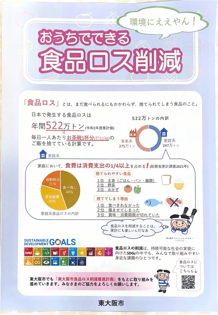年間522万トンもの食品が捨てられているそうです。毎日一人当たりお茶碗1杯分(113グラム)捨てている計算だそうです。そのうち、半分が家庭から、半分は事業系から出ているそうです。