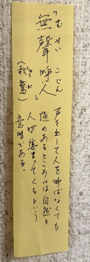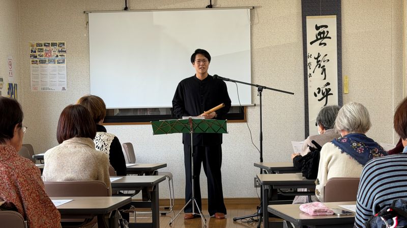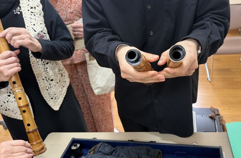 参加者は興味津々で、「竹に穴が5つしかないのにどうしていろんな音が出るのですか?」その答えは、息の入れ方なんだそうです。指はもちろんなんですが、息の強弱などで変わるのだそうですが、練習があってのことなんだろうと思います。普通はなかなか音さえもでないのですが。